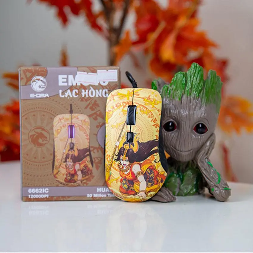 E-Dra EM640 chính là mảnh ghép tiếp theo trong bộ sản phẩm "LẠC HỒNG" của hãng, đây là dòng sản phẩm chủ đạo mang đậm tính dân tộc và có có chất lượng rất cao. Lớp vỏ của chú chuột gaming được in phủ hình ảnh cách điệu hoạt họa của mẹ Âu Cơ - Chim Lạc với cách phối màu Vàng - Cam - Đỏ rực rỡ và đẹp mắt. Chất lượng in rất tốt, độ hoàn thiện cao cho E-Dra EM640 vẻ ngoài rất ấn tượng.